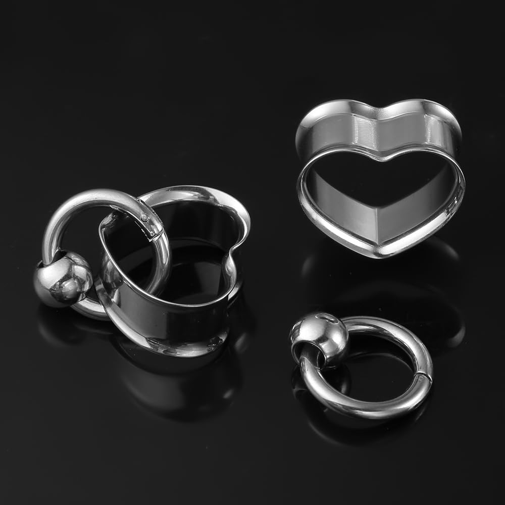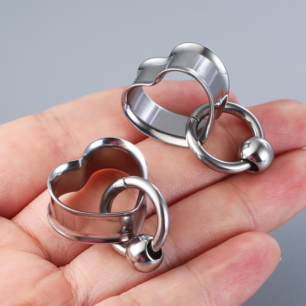2 PCS Ear Gauges Classic Heart Design with 1 ring+1 ball Hypoallergenic 316 earrings weight Stainless Steel Ear Stretchers Plus Tunnels (0G-1") 8mm-25mm 00G Body Piercing Jewelry