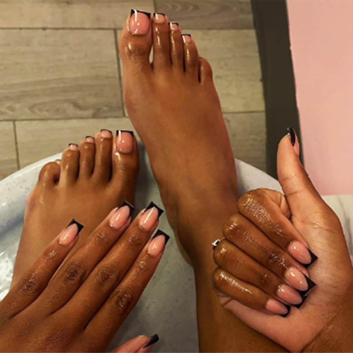 48Pcs Black French Tips Press on Nails and Toes Nails with Simple Design, Glossy Nude Medium False Nails Gel Glue on Nails, Manicure Art Acrylic Fake Nails Stick on Nails for Coquette Women Girls