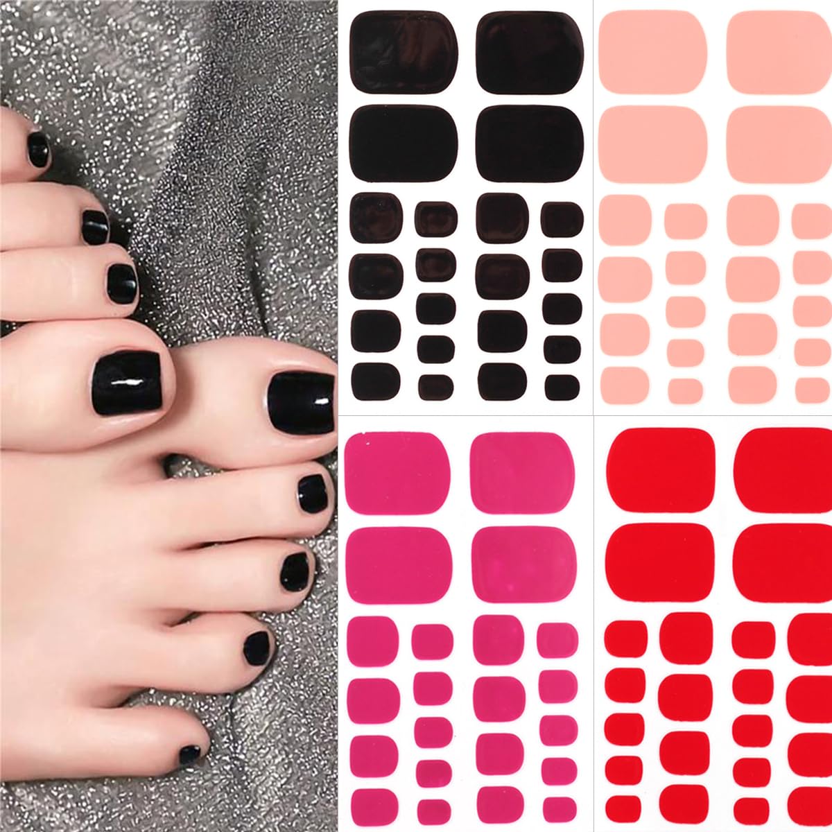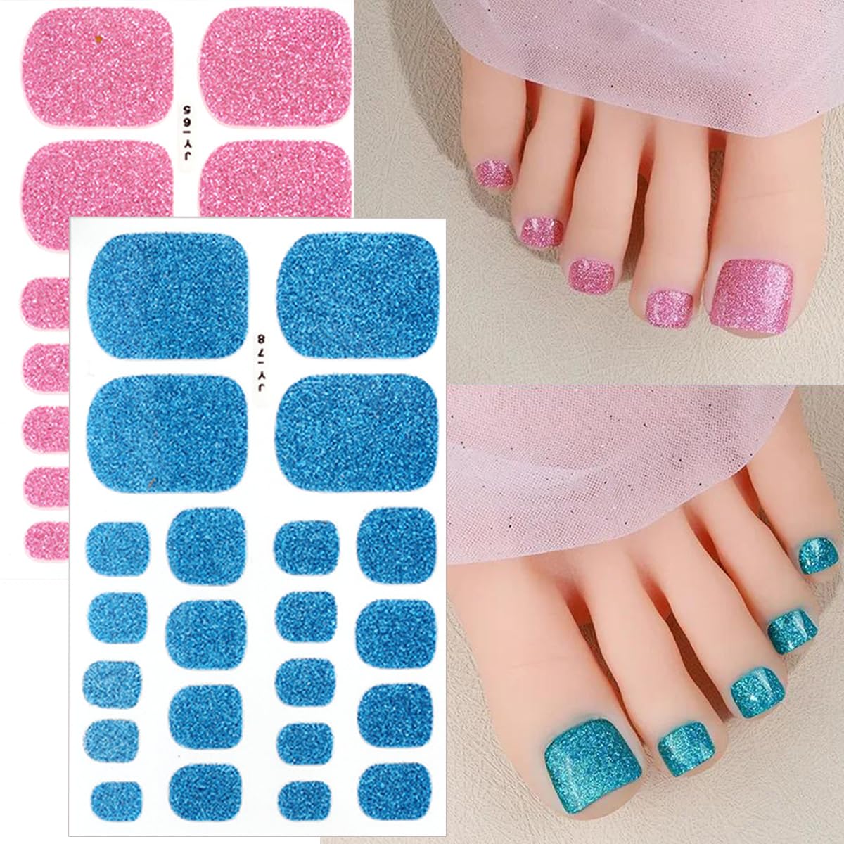 3D Glitter Toe Nail Art Polish Strips Full Wraps Nail Stickers Solid Color Toe Nail Polish Stickers Semi Cured Toenail Gel Strips Self Adhesive Toenail Decals for Women Girls Nail Art Supplies